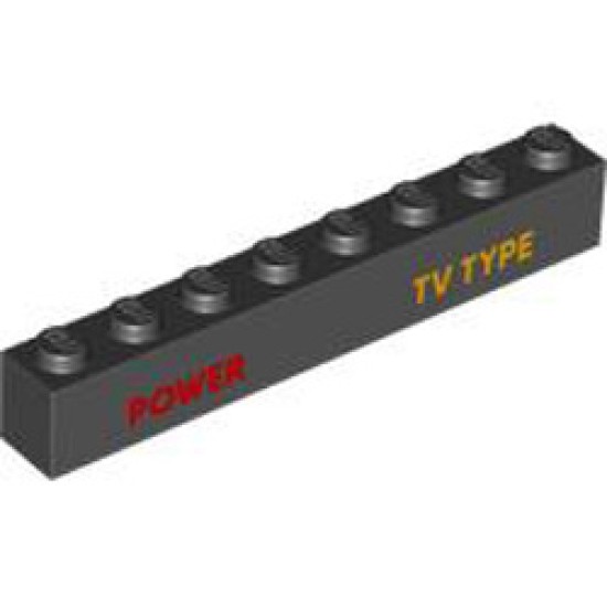Black Brick 1 x 8 with Red 'POWER' and Bright Light Orange 'TV TYPE' Pattern