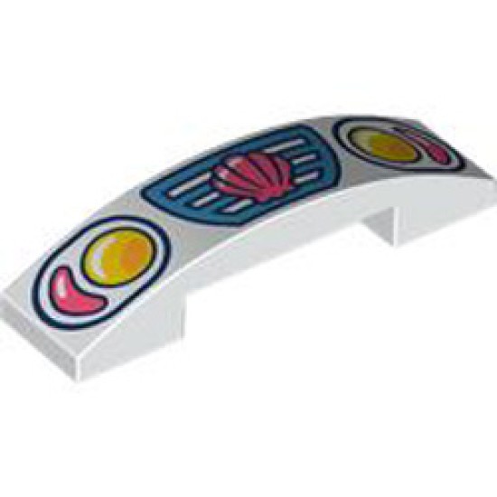 - Alternate Name: White Slope, Curved 4 x 1 x 2/3 Double with Dark Azure Car Front Grille with Coral Clam Shell and Yellow and Bright Light Orange Headl